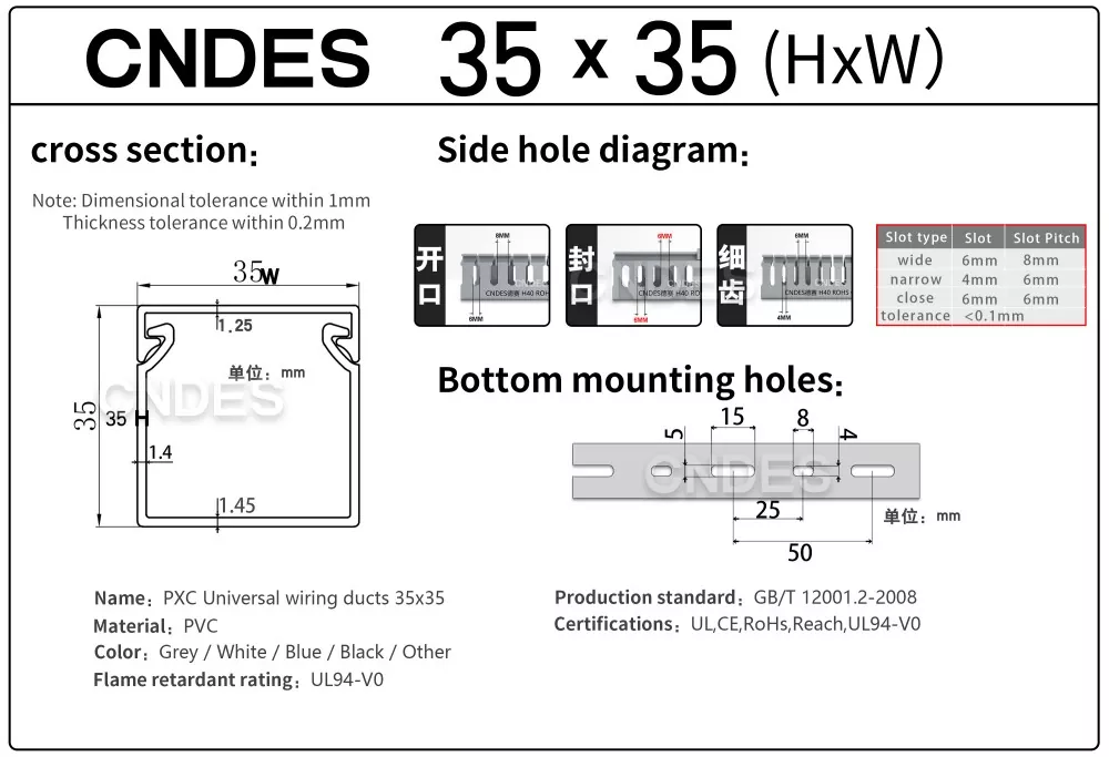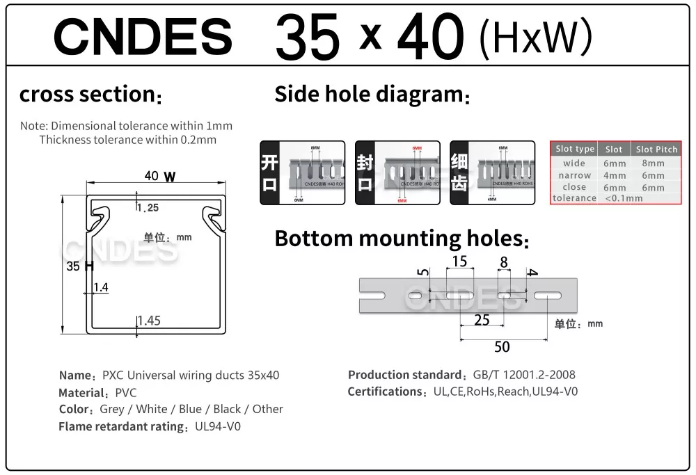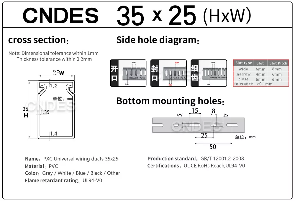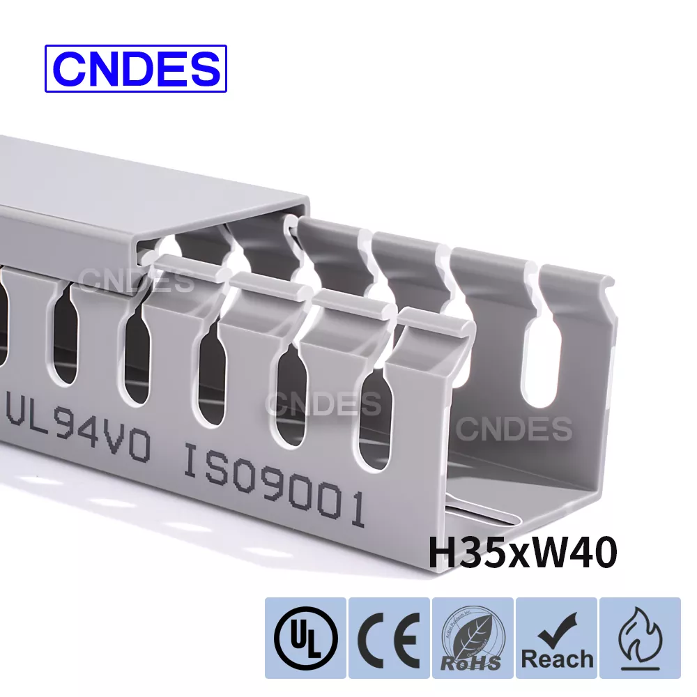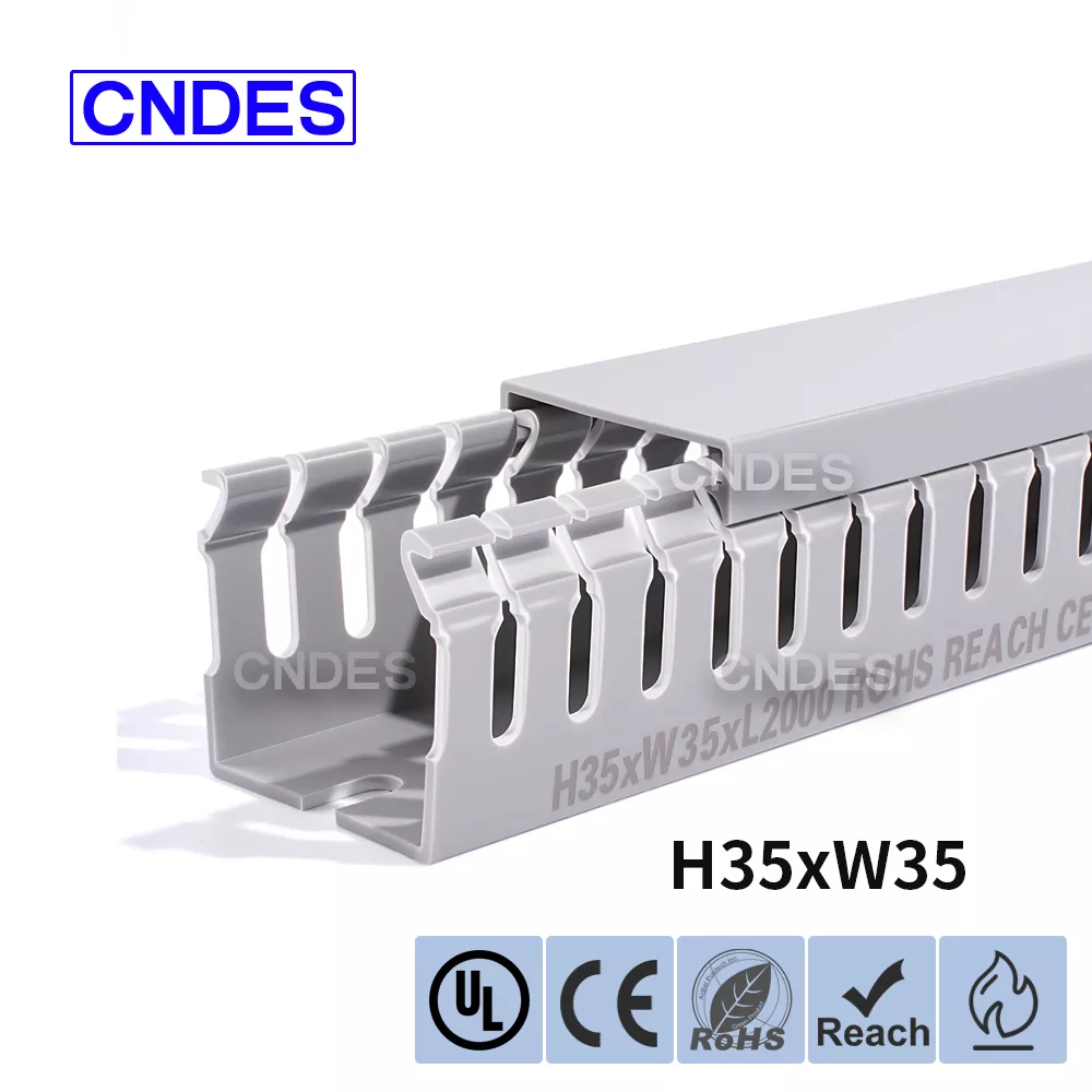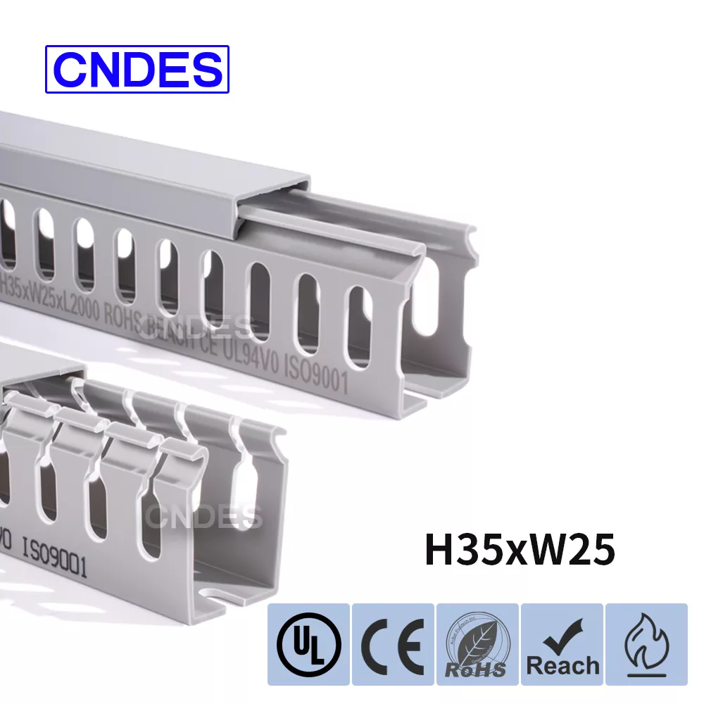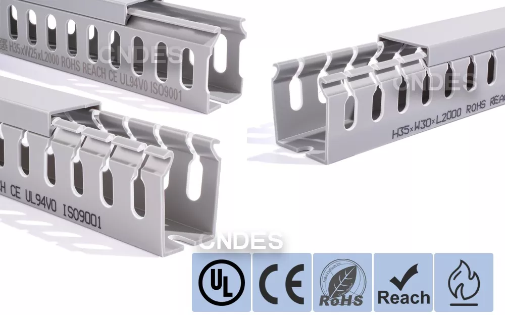 Lorem 35mm Altitudo Slotted PVC Wire Routing Duct, fabricata a Sinarum societate CNDES, constat in basi rigido PVC et operculo amovibili. Basi lineamenta aequidistant, digitorum striati utrinque impressi, "pectenos dentes" formantes. Hi dentes manu frangi possunt, filum ut ab aliquo loco horizontaliter exire sinit. Tegumentum facile tortum in locum, elegantem speciem servans. A versu escendendi foraminum in fundo conforme est DIN 43659 vexillum spatium. Celeriter muniri potest ad tabulas, tabulas, tabulas, vel similes structuras utentes cochleis M5 vel rivets.