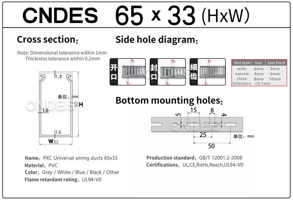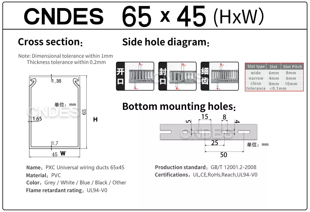 CNDES est funis ductus ductus officinas PVC cum 24 annis experientiae. Mos 65mm Altitudo Slotted PVC Industrialis Wiring Duct optima solutio est pro ordinandis et custodiendis wiring in ambitus altitudinis densitatis, ut tabulae ditionis industriae, automationis instrumentorum, et officinarum machinarum. Cum 65mm altitudine, amplum spatium praebet ad ampliores funes manipulos accommodandi dum optimalem tutelam a factoribus environmentalibus ut pulvis, umor, et damnum mechanicum cavet.