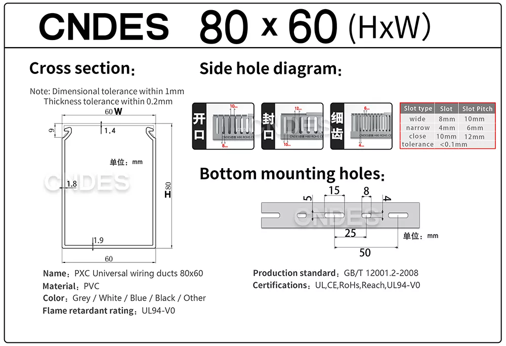 4. Nostri UL 80×60 Recensentur Slotted PVC Wiring Duct plene obtemperent UL, CE, RoHS, et signis certificationibus SPATIUM, quod specimen pro mundi inceptis facit.